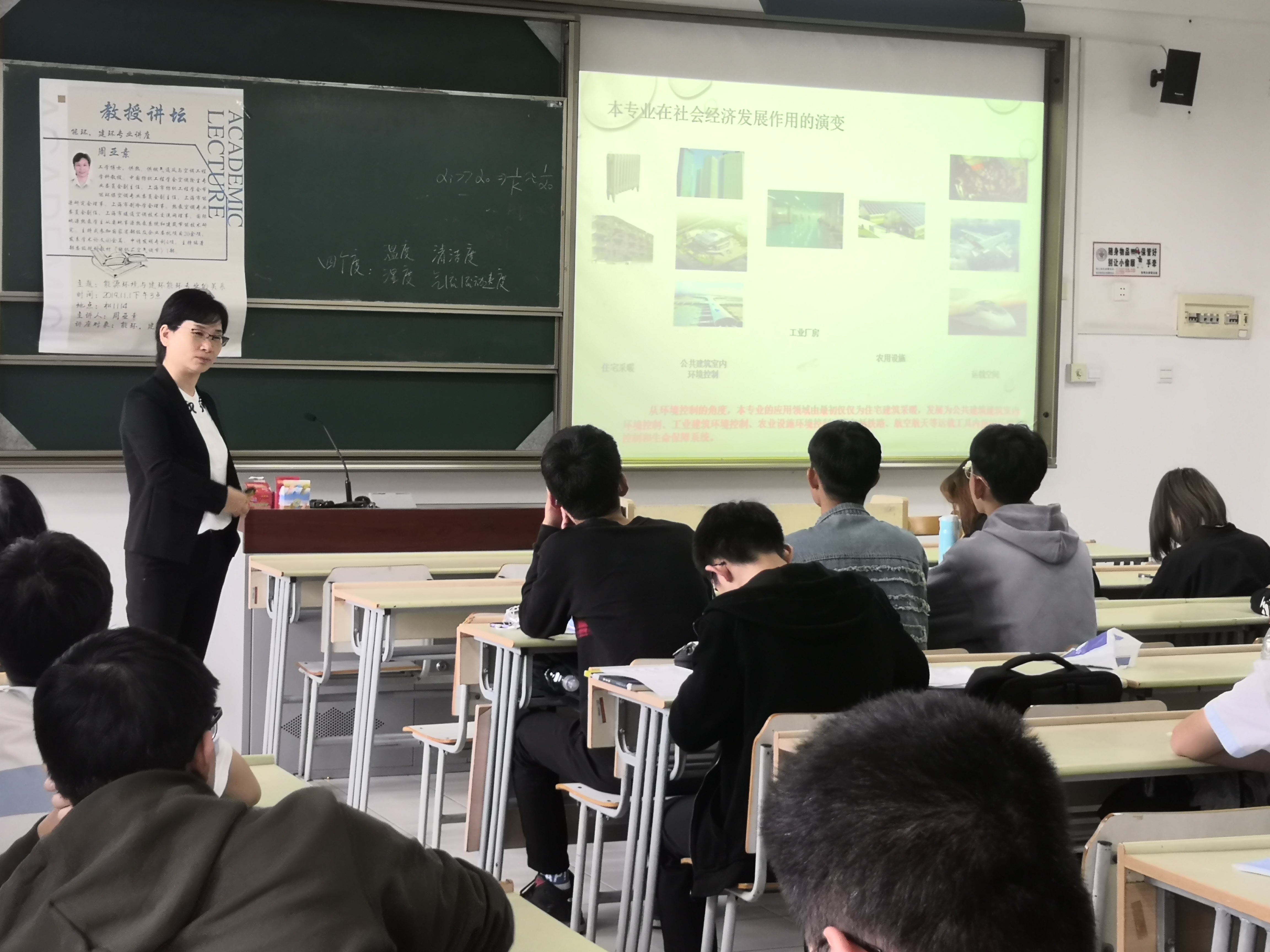 经负责人短暂介绍后,同学们用热烈的掌声欢迎了周亚素教授的到来。首先,周亚素教授通过简明而生动的PPT展示了专业在社会经济发展作用的演变过程,引起了同学们的兴趣,使同学们了解到随着时代经济的发展,自己的专业在社会经济发展中越来越重要、越来越必要。之后,周亚素教授介绍了当今能源和环境之间的直接、间接的联系,介绍了新能源、清洁能源的种类,以及使用对环境友好的能源对于建环能环专业的重要性。这通过对能源环境概念的剖析,不但扩展了同学们的专业知识面,还引起了同学们对当今环境形势的关注,使同学们明白自己专业对“绿水青山”的有利性。能源与环境不可分割,同样,能源环境与建环能环也不可分割。最后,周亚素教授以图文并茂的方式,结合实际应用,将两个专业的知识缓缓道来,分析了两个专业方向的侧重点以及异同及具体应用,揭示了专业的互补性和相关性,使同学们热情大增。