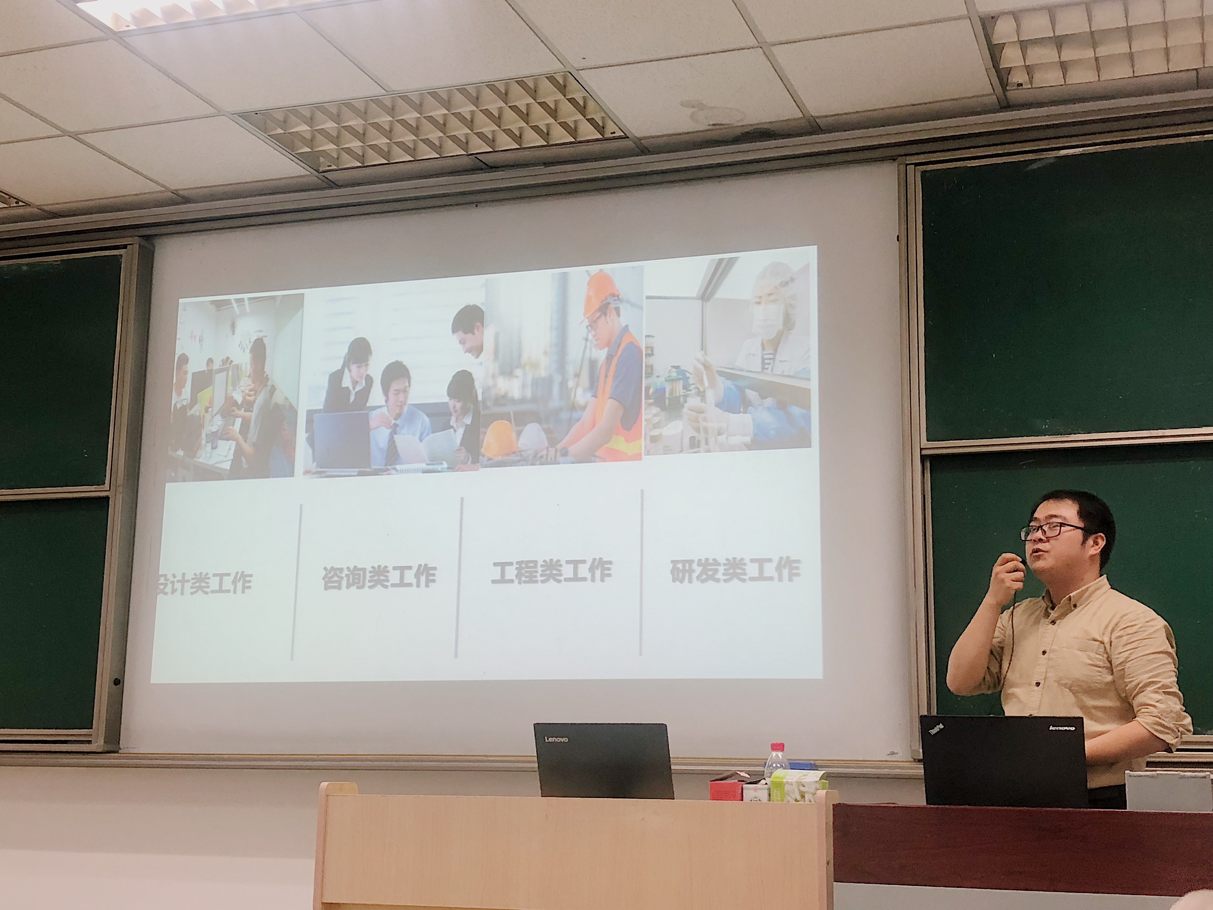 接下来,吴亮针对环保专业毕业后的择业选择为同学们展开了详细的介绍,包括往届本专业毕业生的就业方向,如专业对口的环评单位、环保工程公司、监测单位、环保局等政府事业机构,与专业相关的工程公司、设计院以及与专业关联度不大的其他选择。吴亮还带领同学们具体了解不同环保职业的工作常态,如设计类、咨询类、工程类、研发类、销售类、公务员等,就每一类型的职业在工作内容、工作强度、薪资待遇等方面的不同特点,一一为在场同学做了细致解读。
