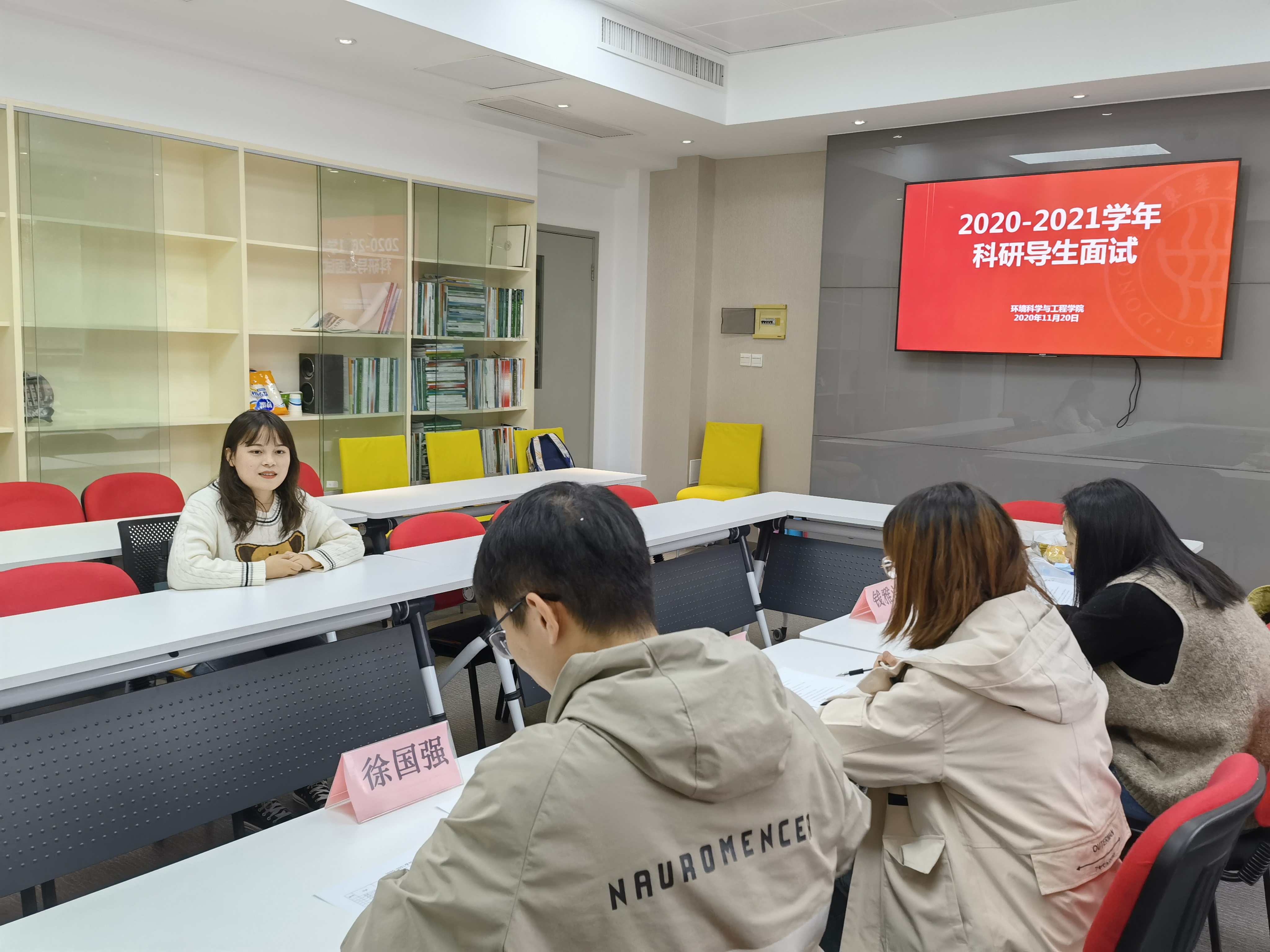 为进一步提升学生科技创新能力,加强学风建设,11月20日,环境学院在学院楼3150开展2020-2021学年科研导生遴选工作,对申请科研导生的学生进行面试,担任此次面试的评委有环境学院2020级班导师钱雅洁、学风工作负责人孙璐璐、2020级本科生辅导员张雅静及优秀科研导生代表徐国强。